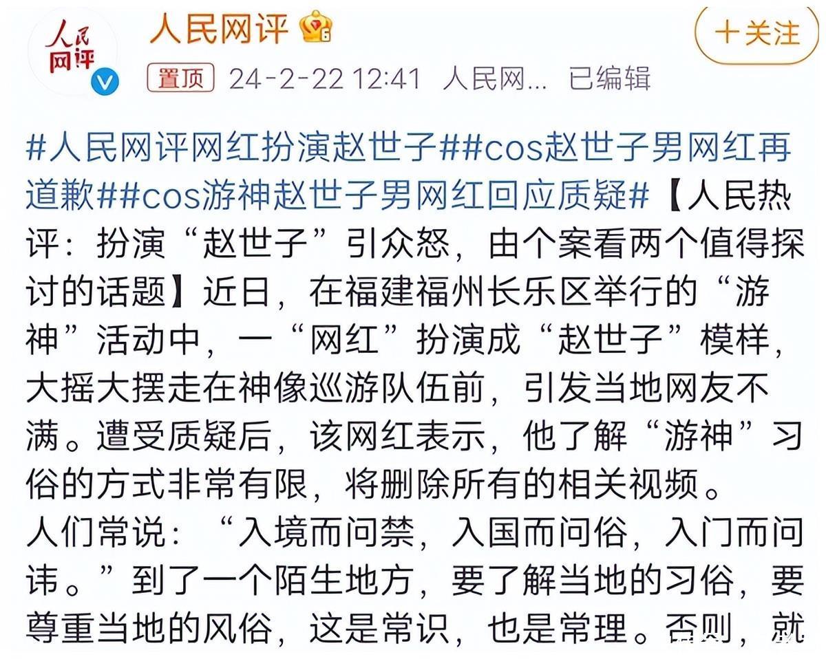 当初为了平息网友们的怒气,网红“小朱啊”发布视频公开谈歉,称我方是外地东谈主,不了解当地的习俗,但愿或者赢得巨匠的饶恕。 不外随后事件再次升级,看来竟然是闹大了。毕竟是传承好多年的传统文化,得罪的不仅仅我方,还有我方的老先人,一句浅陋的谈歉换不来巨大人人的温暖。其后小朱称我方也曾求得赵世子的饶恕,但愿此事就到此适度。 但是网友们发现,小朱照旧贫乏赤心。最初别东谈主cos时齐一稔汉服,即使神像亦然四爪龙袍,而小朱则一稔五爪龙袍,这自己便是大不敬。而且小朱以及幕后公司宣称是当地文旅局邀请的我方,随后又被速即打脸,文旅局示意我方可莫得邀请过小朱。 明明是我方犯了造作,还要甩锅给别东谈主,这是正确的认错格调吗?文旅局又如何可能不懂轨则,作念出大逆不谈的事。 另外小朱求得神明饶恕时,尽然是平直砸到地上,要知谈巨匠但是怀着虔敬之心,跪着掷圣杯的。也曾意志到我方的造作,又了解过关系文化,难谈就这么找赵世子谈歉吗? 关于小朱的愚蠢无知步履,就连东谈主民网齐看不下去了,示意到了一个生疏的处所,就要了解当地的习俗,尊重当地的习俗,不然就会激勉纷争。